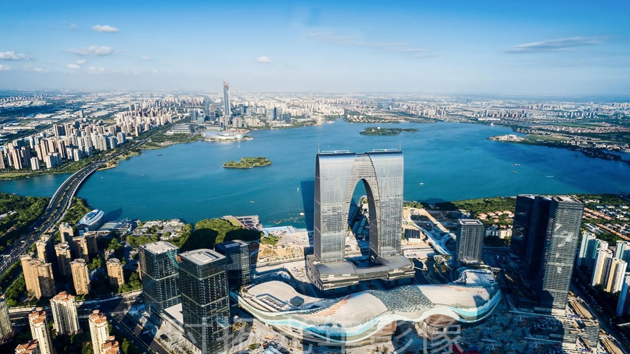 苏州中心广场项目位于苏州工业园区金鸡湖西侧,毗邻东方之门,居苏州市域CBD核心位置,轨交1号线、6号线贯穿整个项目区域,整体占地21.1公顷,净地面积13.9公顷,总建筑面积约182万平方米,其中地上建筑面积130万平方米、地下建筑面积52万平方米。