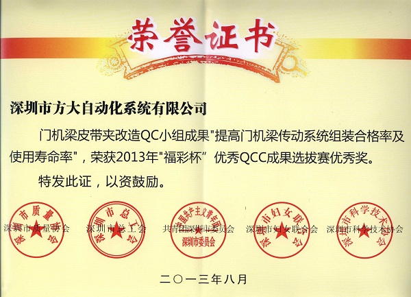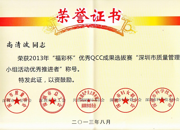 深圳市2013年质量管理小组活动优秀企业及“福彩杯”QCC成果选拔赛优秀奖是由深圳市质量协会、深圳市科技技术协会、深圳市总工会、深圳市妇女联合会和共青团深圳市委员会联合评定,旨在表彰在2012年度深圳市质量管理小组活动中涌现出的优秀企业和优秀QC小组。质量管理小组活动优秀企业是由同一工作场所的不同企业员工组成质量管理小组,运用质量管理的简易统计手法及工具,分析解决工作场所的问题以改善业绩的质量管理活动。