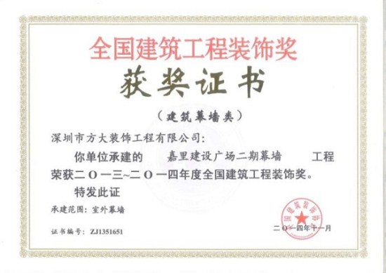 “2013-2014年度全国建筑工程装饰奖”获奖结果在北京揭晓,深圳市方大建科集团有限公司荣获四项建筑幕墙类大奖,获奖项目分别为:中铁南方总部大厦幕墙工程、大连万达公馆1#楼幕墙工程、嘉里建设广场二期幕墙工程、中广核大厦幕墙工程。
