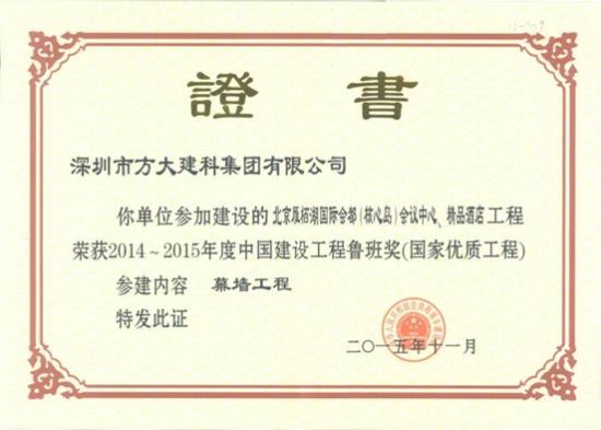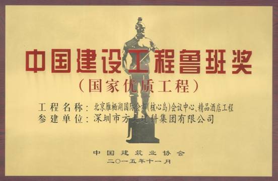 11月17日,中国建筑业协会在北京举行中国建筑行业最高奖——2014~2015年度中国建设工程鲁班奖(国家优质工程)表彰大会,在本届鲁班奖表彰大会中,九游体育网页版登录入口全资子公司深圳市方大建科集团有限公司凭借精心打造的高标准、高质量幕墙工程的北京雁栖湖国际会都精品酒店,获得2014~2015年度中国建设工程鲁班奖,“方大品质”作为“深圳质量”的典范再度被全国建筑工程领域所瞩目。