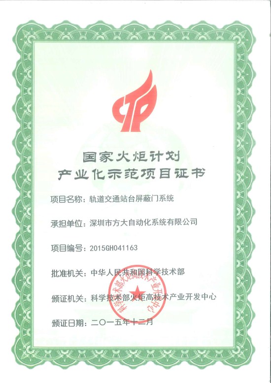 国家火炬计划产业化示范项目是要求属于国家鼓励发展的重点振兴产业和战略性新兴产业领域,是对“转方式、调结构”及地方产业优化升级有带动和示范效应的高新技术项目,有自主知识产权、推动产学研结合的科技成果产业化项目。方大集团“轨道交通站台屏蔽门系统”被列入“国家火炬计划产业化示范项目”标志着公司在自主知识产权、科技创新能力方面位列国内企业前列,是国家科学技术部对公司科技创新实力的认可。