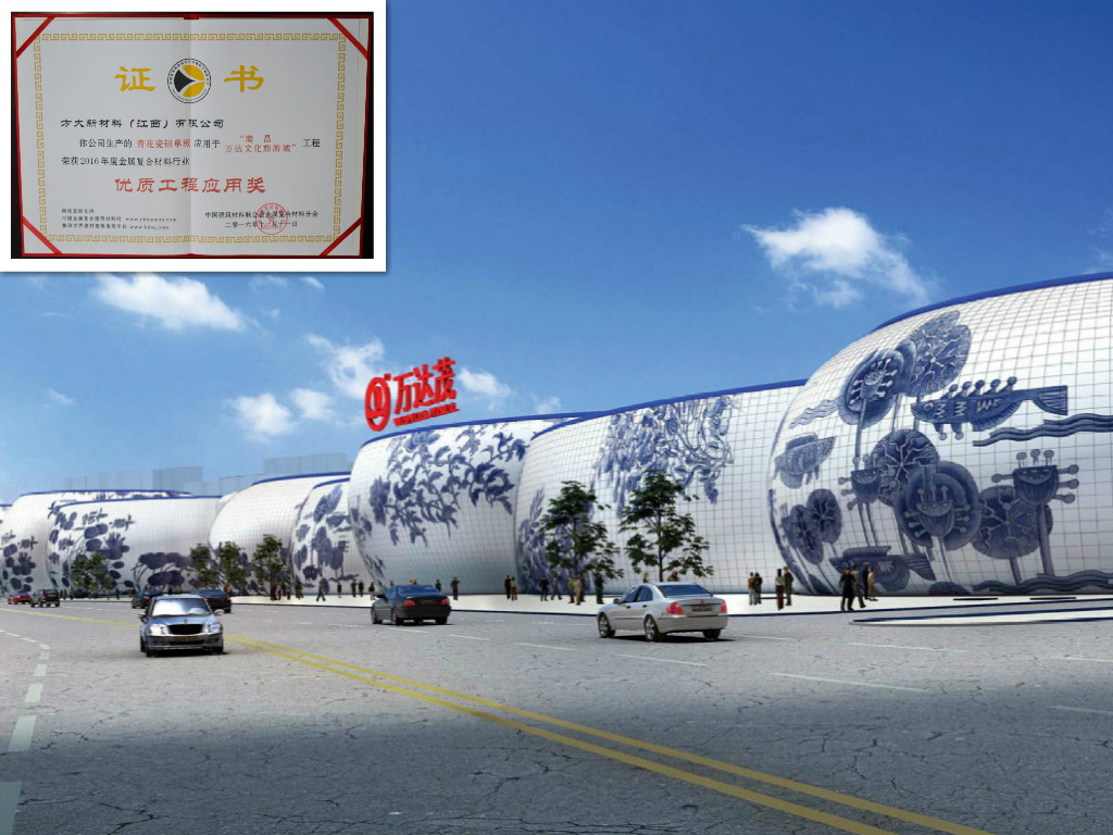 方大青花瓷铝单板应用于南昌万达文化旅游城,荣获2016年度金属复合材料行业“优质工程应用奖”