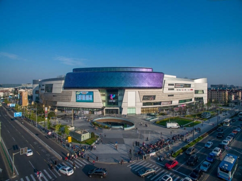 上海七宝万科广场(新建七宝镇53号地块商业项目)位于闵行区七宝镇,是一座集餐饮、休闲、购物于一体的综合性大型商场。广场主入口处采用大面积曲面空间弧形渐变式炫彩铝板幕墙,营造出灵动欢快的视觉效果,散发着浓郁的都市时尚气息,此前国内幕墙工程领域还没有如此大面积炫彩铝板的集中使用。为了达到理想中的渐变效果,公司领导、项目部、设计院及其他相关部门多次赴现场考察、召开研讨会,在大家的共同努力下,顺利解决了铝板喷涂的色差问题。同时,方大人大胆创新,根据曲面、曲线分格把众多小三角形铝板做成单元板块来安装,确保了施工精度,提高了工程进度,节省了项目成本。