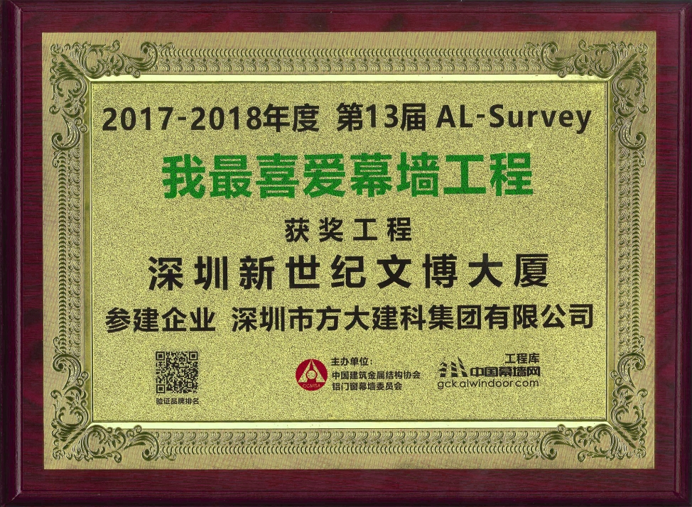 此次,凭借深圳新世纪文博大厦获得行业评选“我最喜爱幕墙工程”奖,反映了业内对该工程幕墙施工技术的高度认同以及对方大建科实力的肯定 ,同时也是方大建科回馈客户信任的最好成绩单。