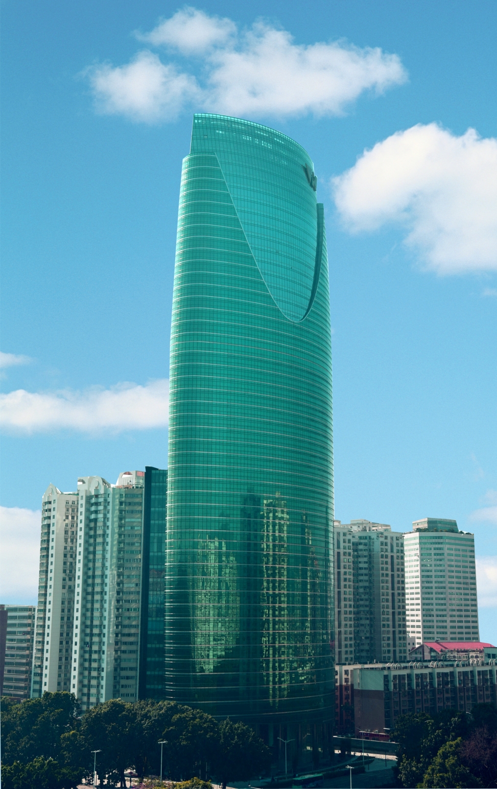大厦外立面主要采用银色铝合金框+绿色和灰色中空LOW-E玻璃幕墙系统,楼层间采用不锈钢装饰板,玻璃幕墙外侧设置横向的不锈钢遮阳板,通过外墙微妙的反光和绿树、蓝天、白云等自然景观和周边建筑物随着时间在建筑物上的倒影变化,同时遮阳板也将随着阳光照射的角度在楼身生成不断变化的影子纹理,使整个建筑变得很丰富,又能与周边建筑和环境相协调。