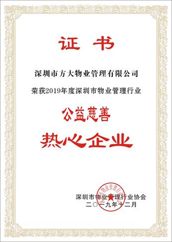 2019年度深圳市物业管理行业“优秀企业”、“公益慈善热心企业”评选由深圳市物业管理行业协会主办,旨在鼓励各物业管理企业积极开展扶贫、济困捐助等公益活动,树立模范典型,发挥榜样示范作用,促进物业管理水平的提高,同时带动更多的企业和从业人员,高质量地推进行业发展。此次荣获“优秀企业”、“公益慈善热心企业”两个奖项,表明对方大物业及公司公益慈善工作的肯定。